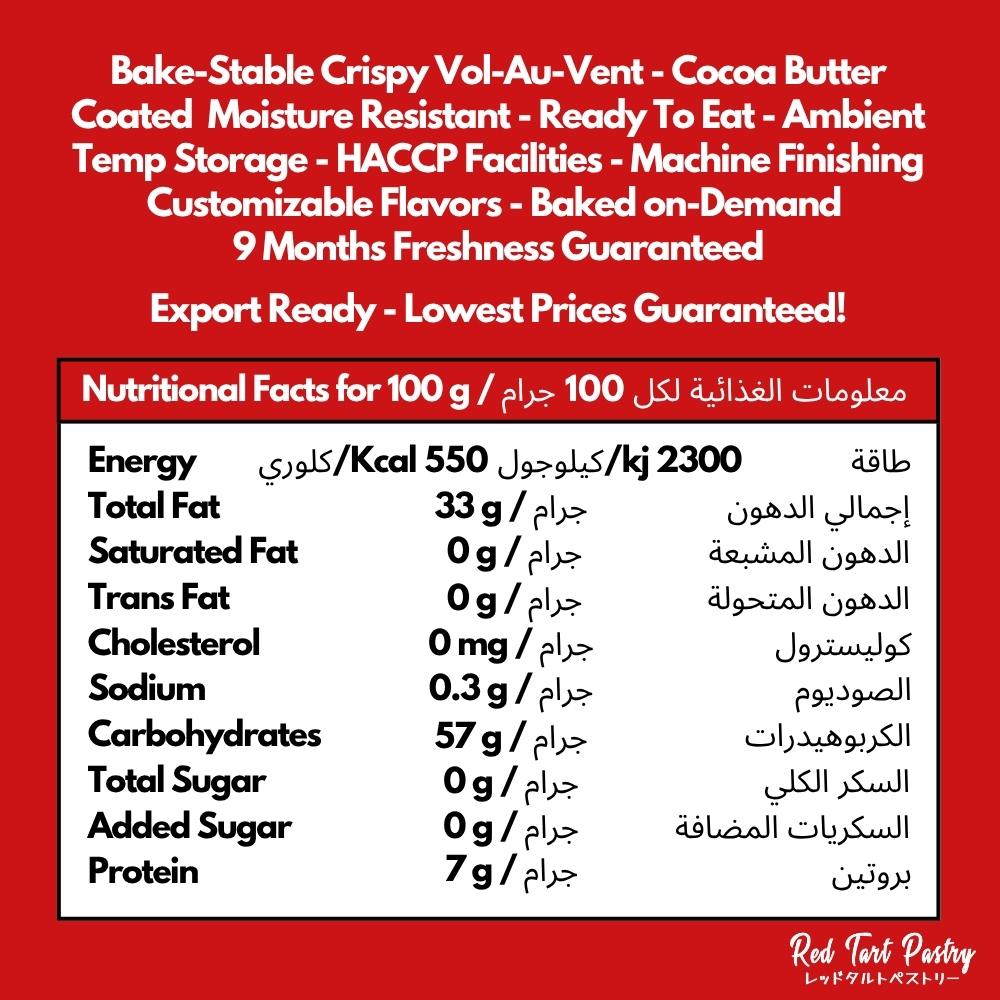 Mini straight-edge Vol-Au-Vent of the French style, thick base and baked on demand for a crispy & savory dish with a golden-white coloring. Pre-baked and bake-stable. Coated internally with cocoa butter for moisture protection, it can be stored at room temperature, in a chiller, or in a freezer (with a plastic sheet).