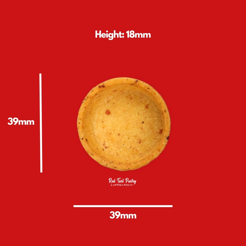 Straight-edged mini round tartlet made from a savory short-crust butter pastry, uses dehydrated Tomatoes and freshly dried Basil to produce a unique base for savory treats. Pre-baked and bake-stable. Coated internally with cocoa-butter for moisture protection and can be placed in room temperature, chiller or freezer (with plastic sheet).