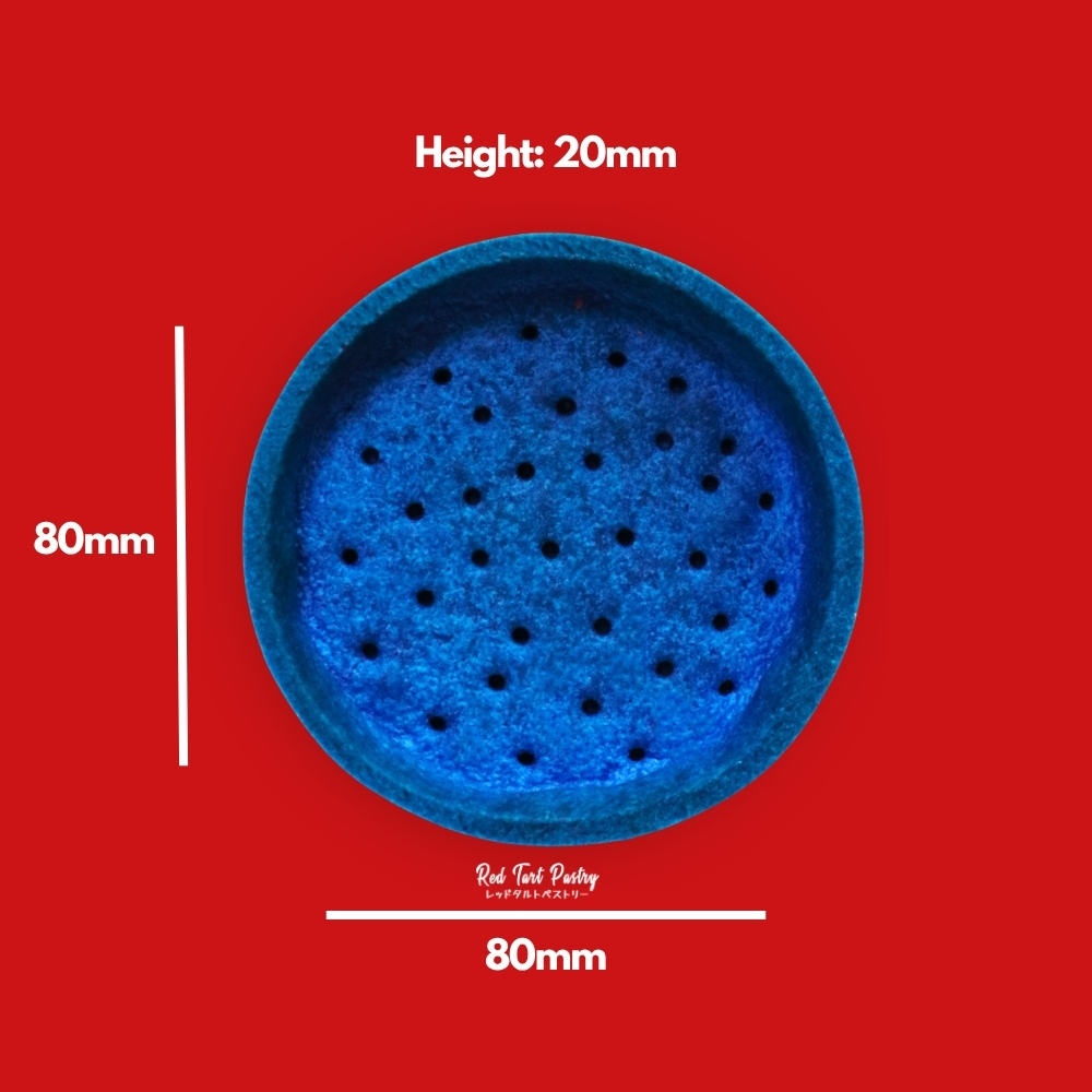 Straight-edged round tartlet made from sweet short-crust butter pastry, uses Blueberry flavoring and premium food-grade coloring (E133) for a brilliant blue texture for sweet treats. Pre-baked and bake-stable. Coated internally with cocoa-butter for moisture protection and can be placed in room temperature, chiller or freezer (with plastic sheet).