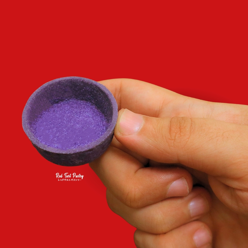 Straight-edged mini round tartlet made from sweet short-crust butter pastry, uses premium food-grade coloring (E133)(E129) for a royal purple texture. Pre-baked and bake-stable. Coated internally with cocoa-butter for moisture protection and can be placed in room temperature, chiller or freezer (with plastic sheet).