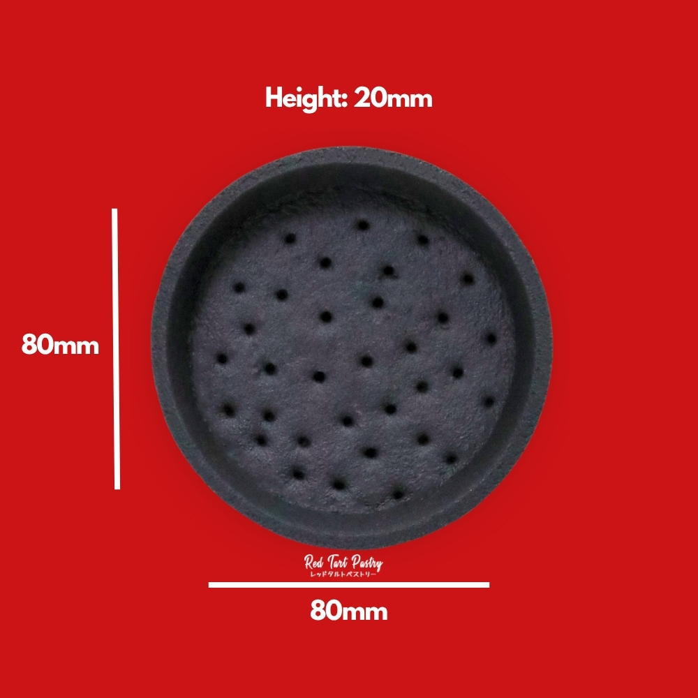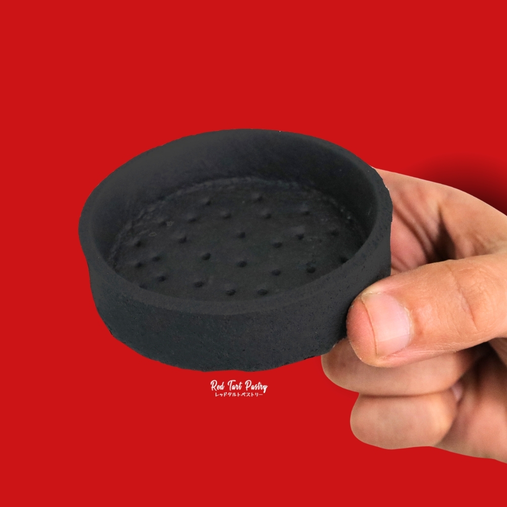 Straight-edged round tartlet made from sweet short-crust butter pastry, uses (food-grade) activated charcoal powder to achieve a deeply black texture. Pre-baked and bake-stable. Coated internally with cocoa-butter for moisture protection and can be placed in room temperature, chiller or freezer (with plastic sheet).